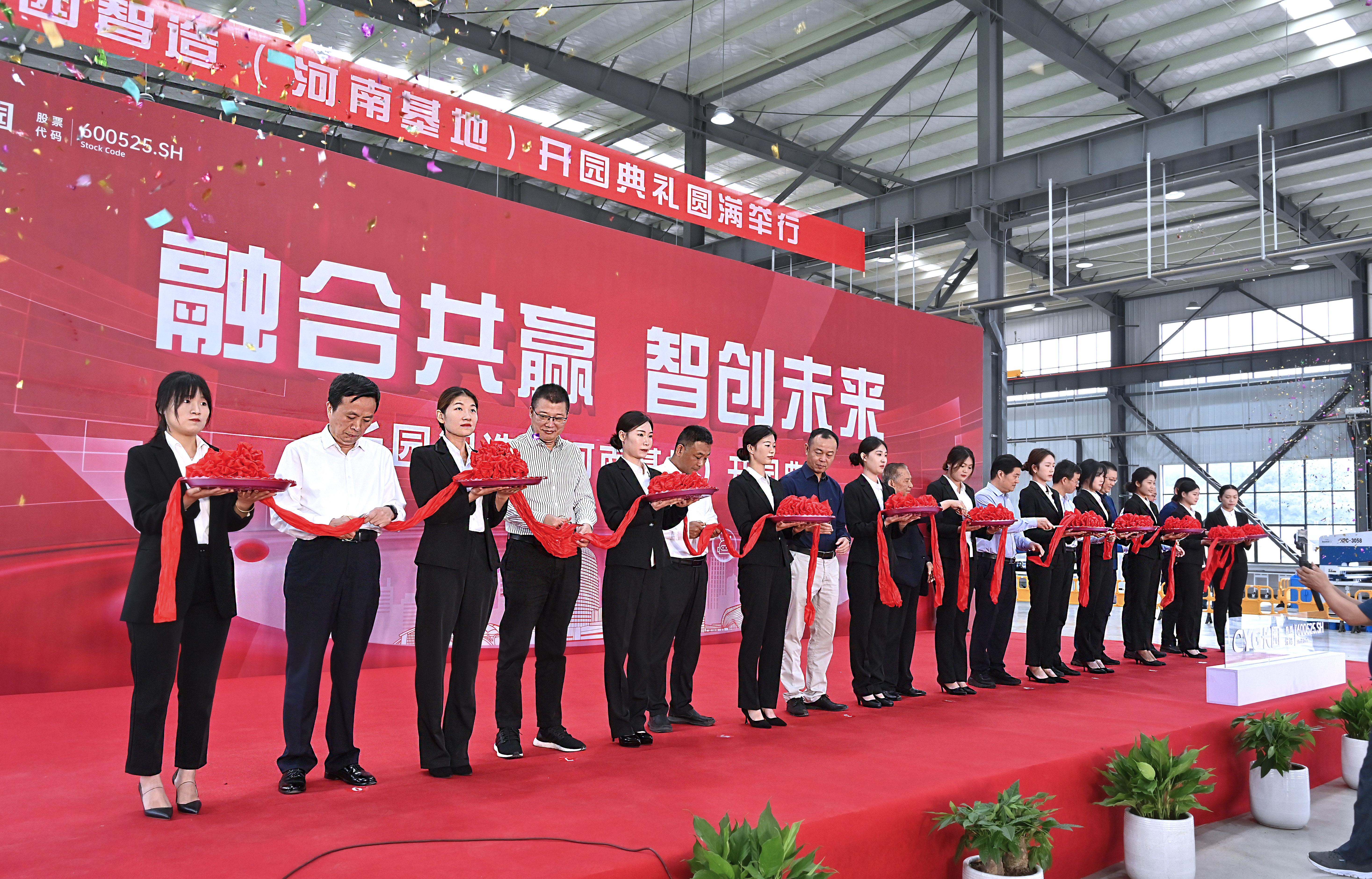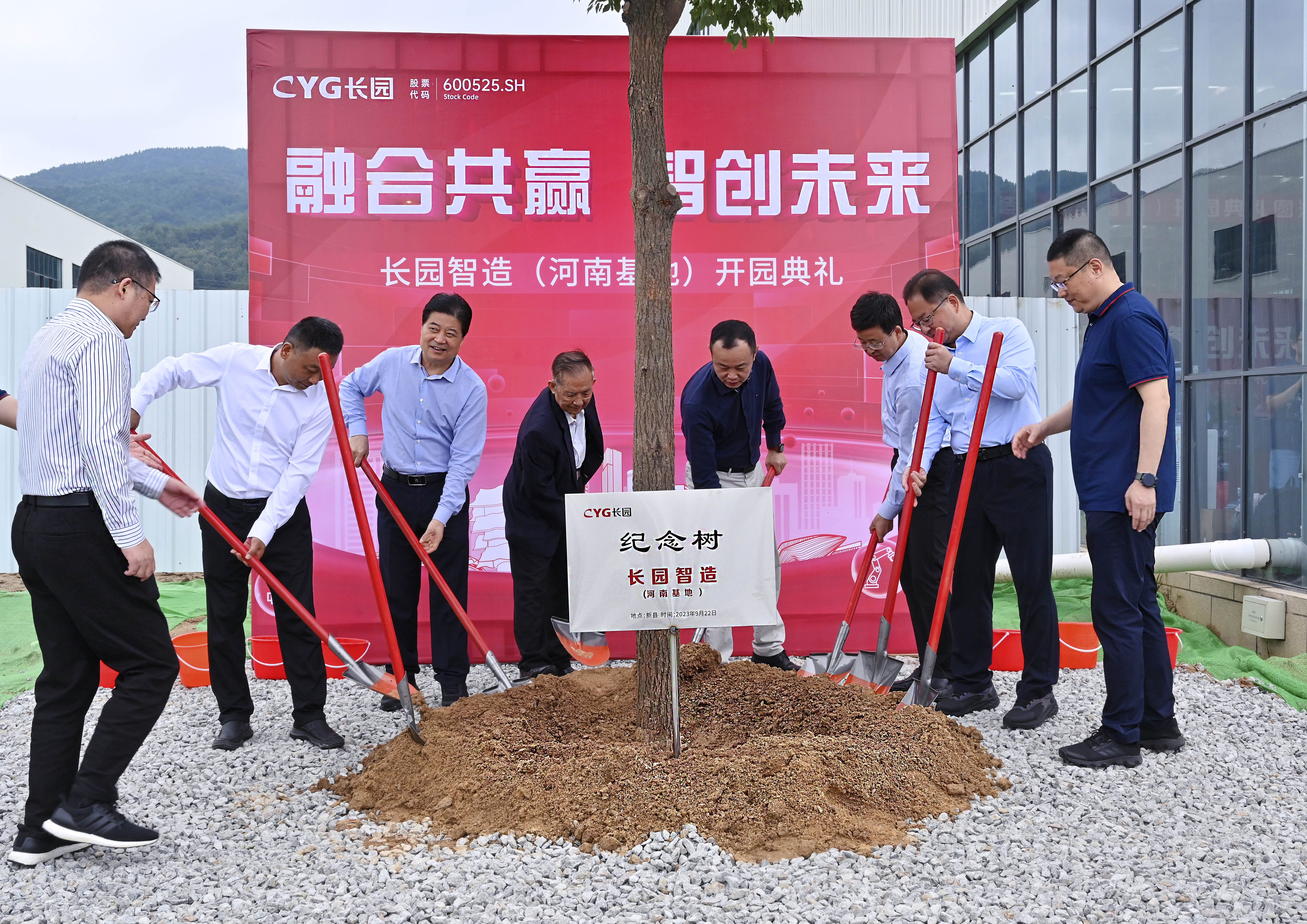 参与剪彩仪式的10位嘉宾领导在一声声倒数及礼炮声中同执金剪,并在基地共同种下一棵香樟树以作纪念。香樟树枝繁叶茂,四季常青,寓意着ok138cn太阳集团智造(河南基地)将像香樟树一样生命力顽强旺盛、扎根新县繁荣生长。