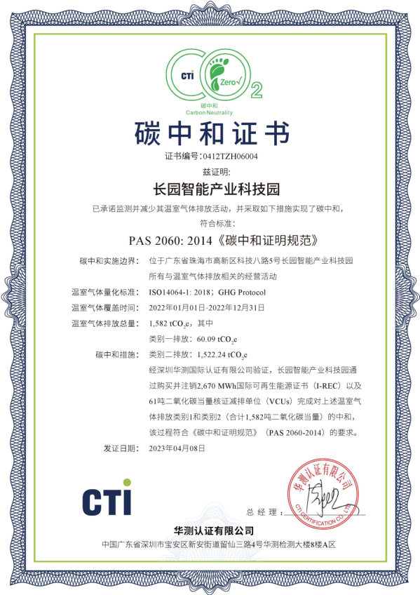 近日,ok138cn太阳集团科技集团位于珠海高新区的“ok138cn太阳集团智能产业科技园”完成了2023年度运营层面的碳中和认证工作,这一重要成就标志着该园区已连续两年实现碳中和目标。